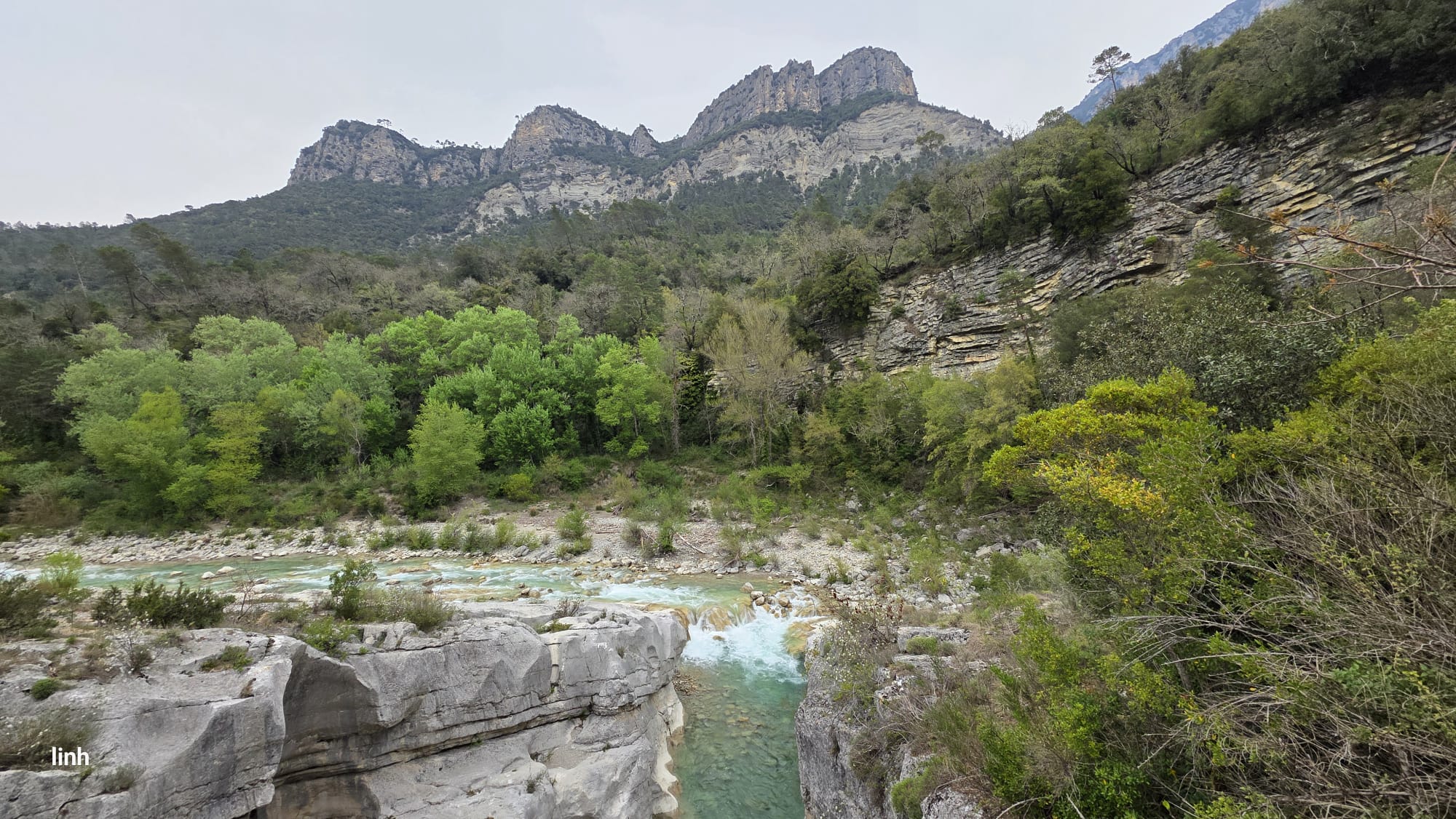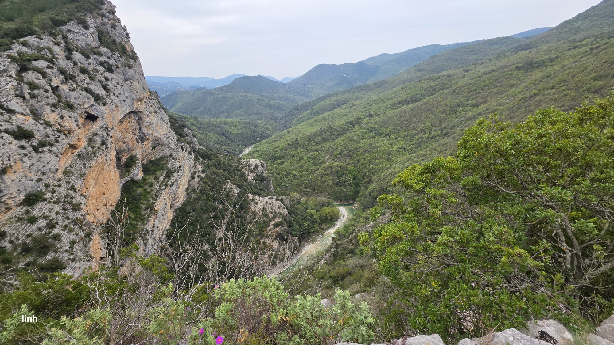 La Descente Initiatique, Le sentier plonge rapidement vers le mystérieux Pont de la Cerise, serpentant à travers une végétation méditerranéenne vibrante de vie. Le parfum des pins, le chant discret du vent… puis, peu à peu, un grondement. Celui de l’eau. C’est l’Estéron qui appelle.