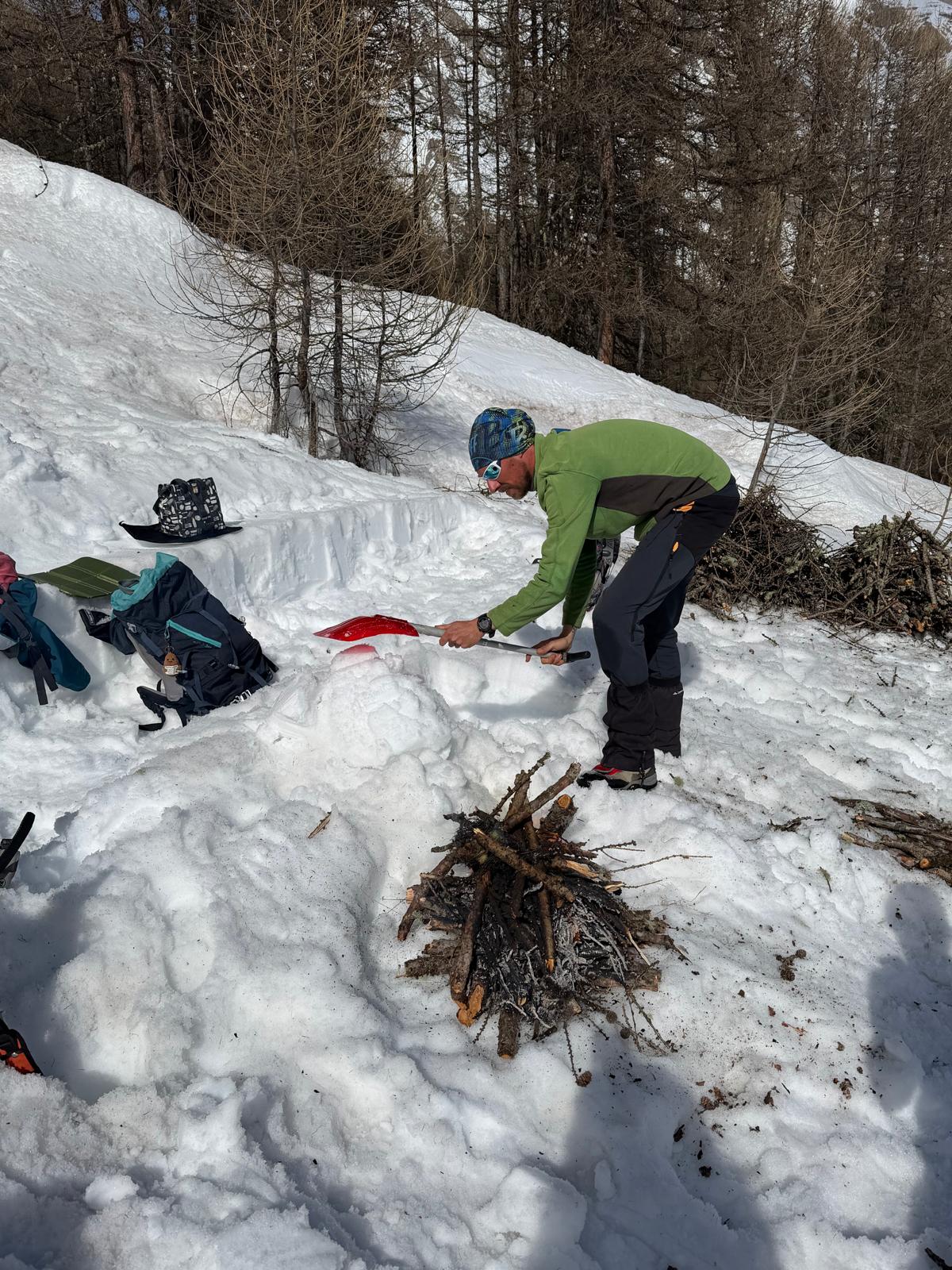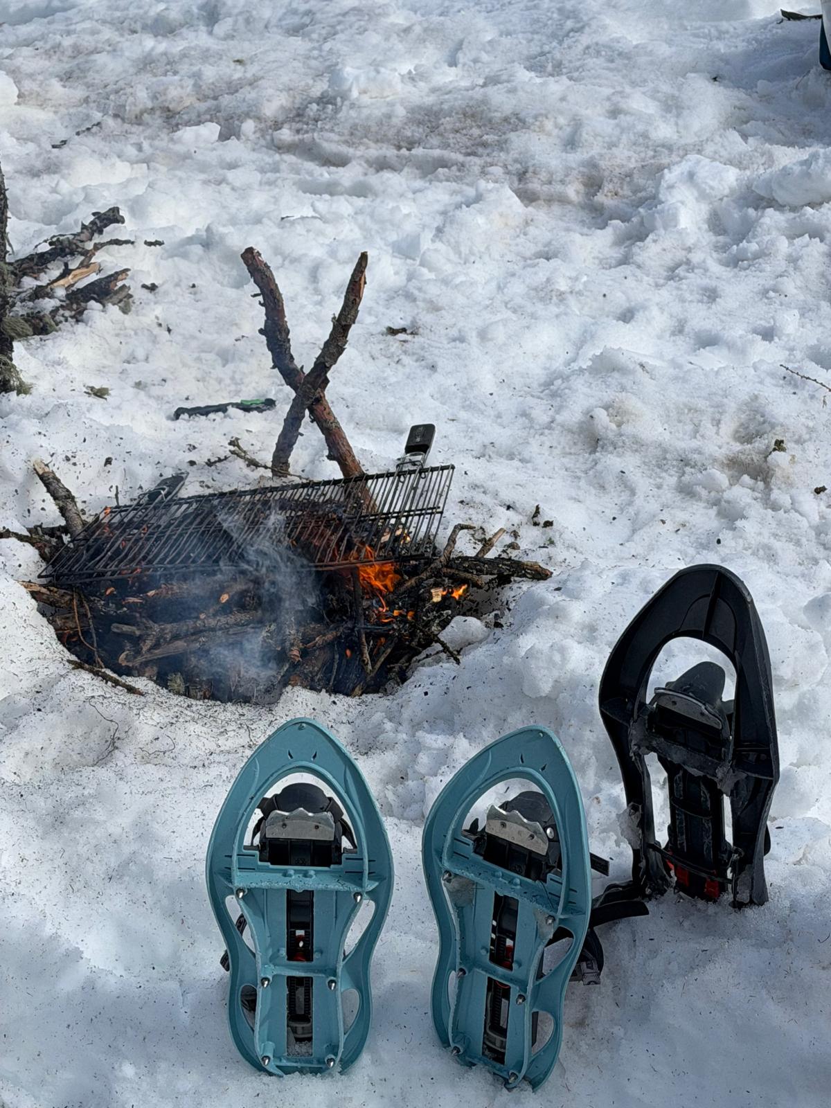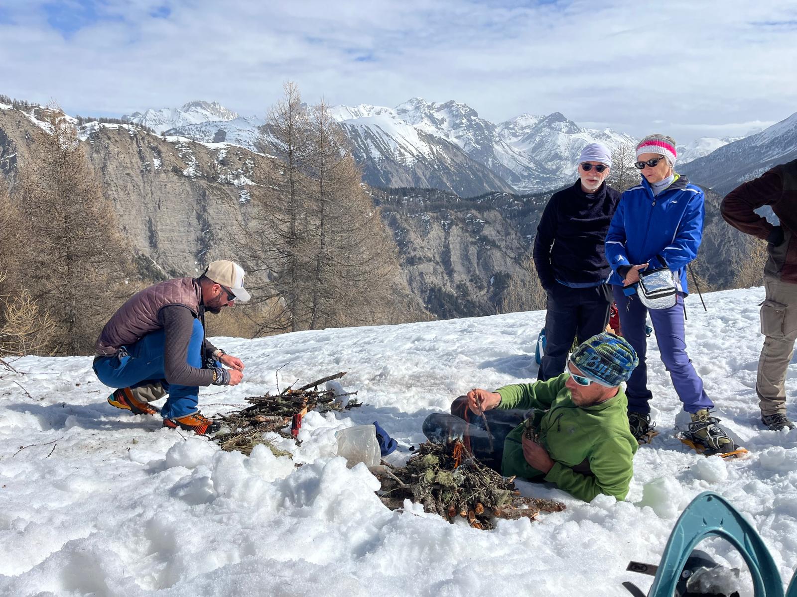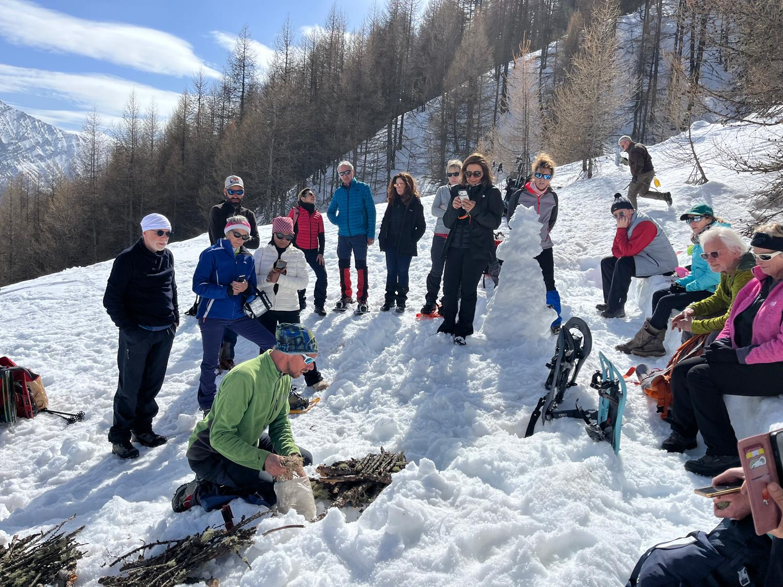 C'est ainsi qu'après avoir cheminé en raquettes, et appris pourquoi les mélèzes perdent leurs aiguilles nous avons : ramassé du bois, de la paille, du lychen, fait un feu 🔥, creusé une banquette dans la neige, dégusté un barbecue, pratiqué le "cul cul glisse" etc, etc ....