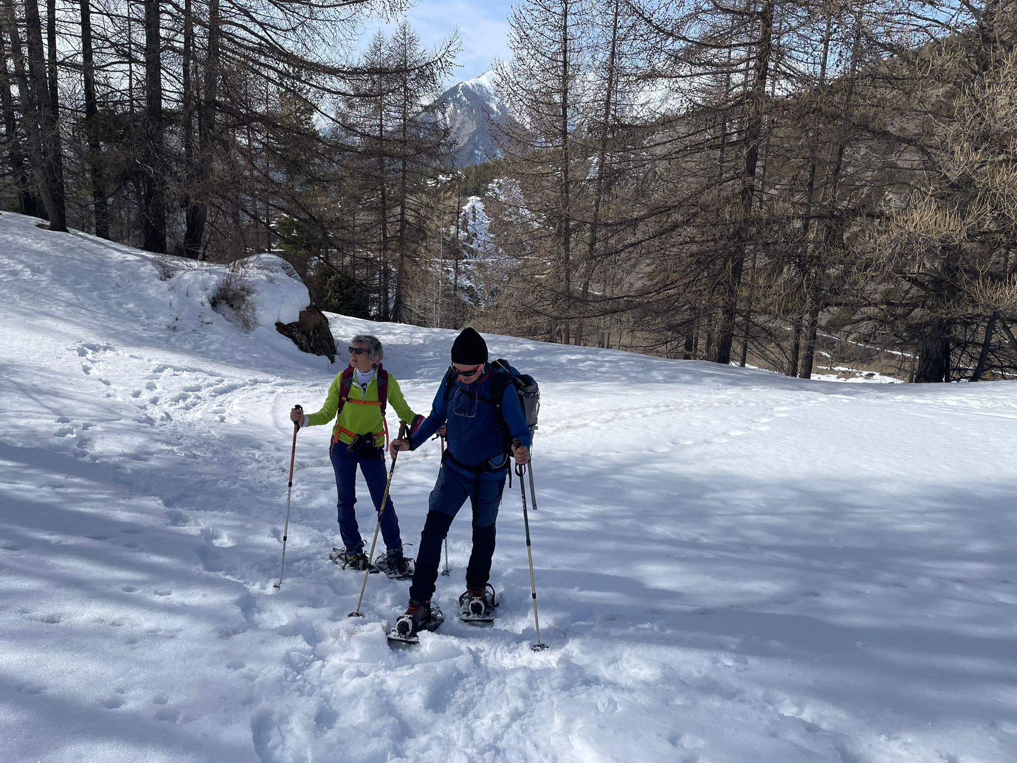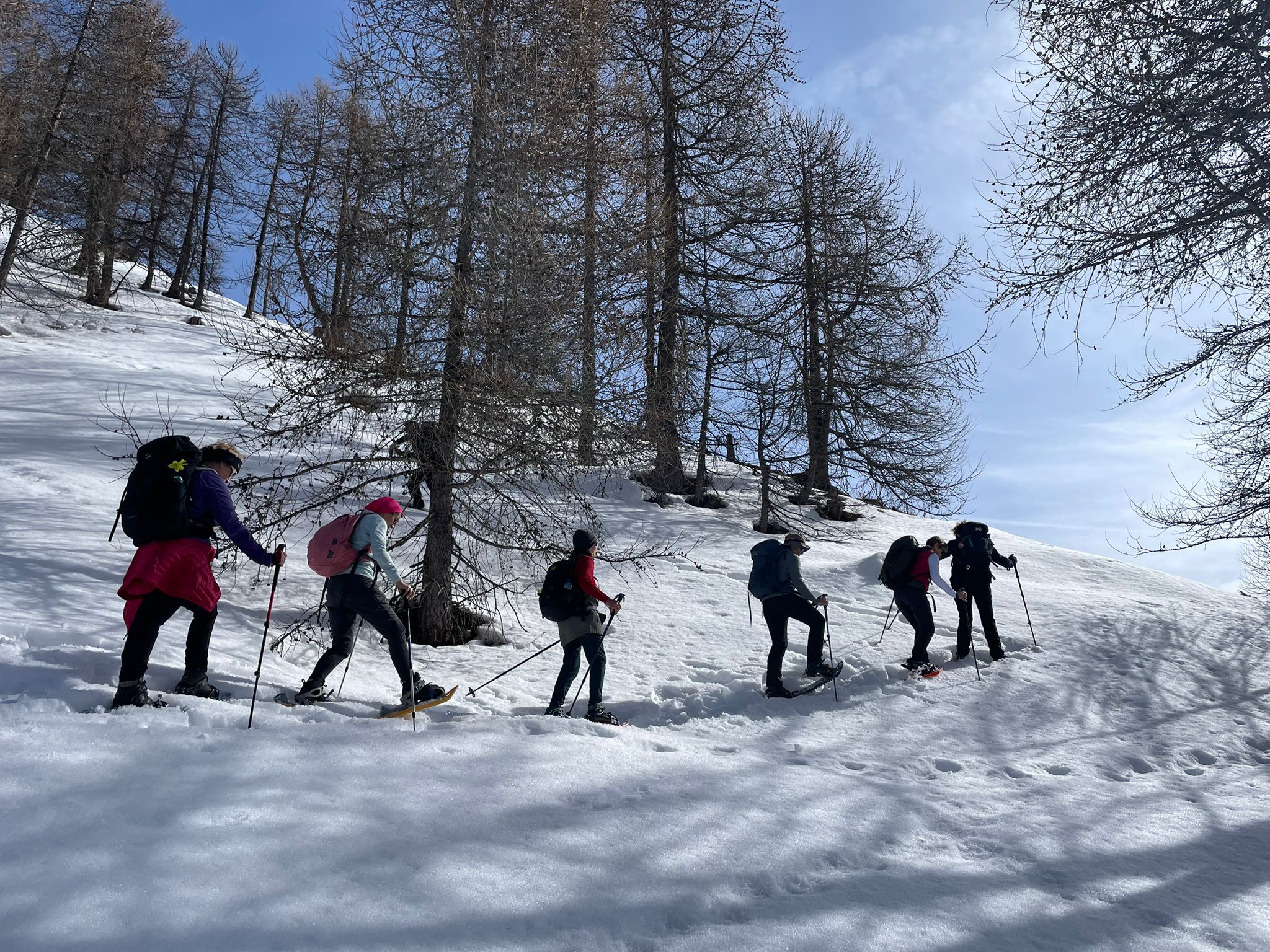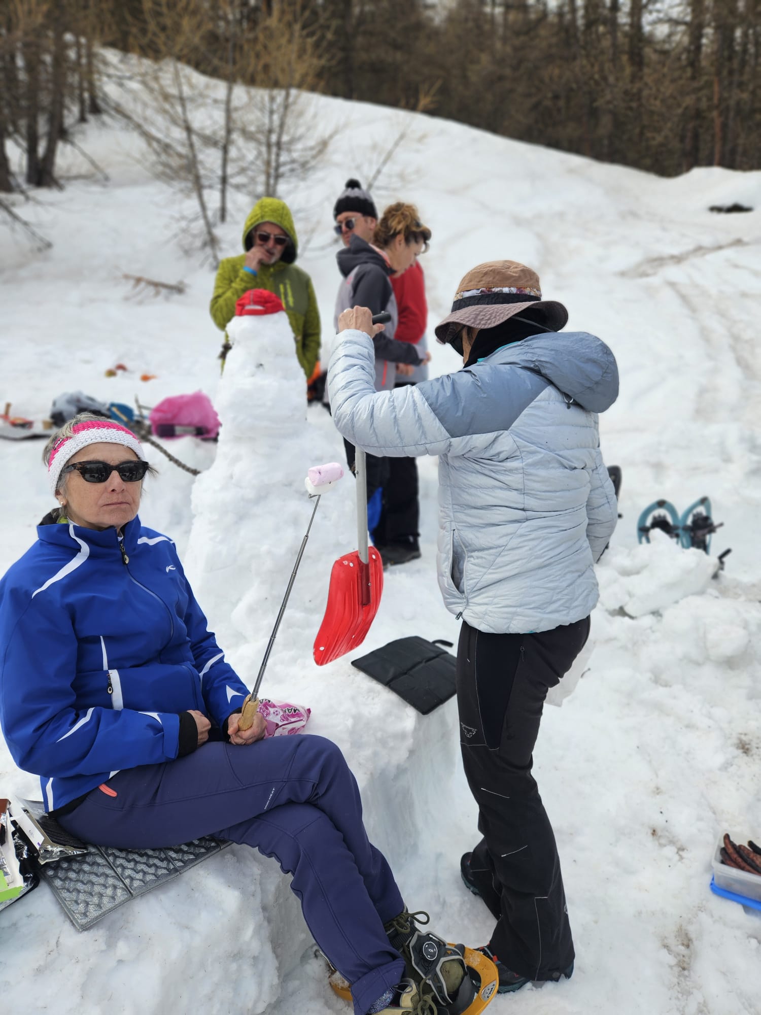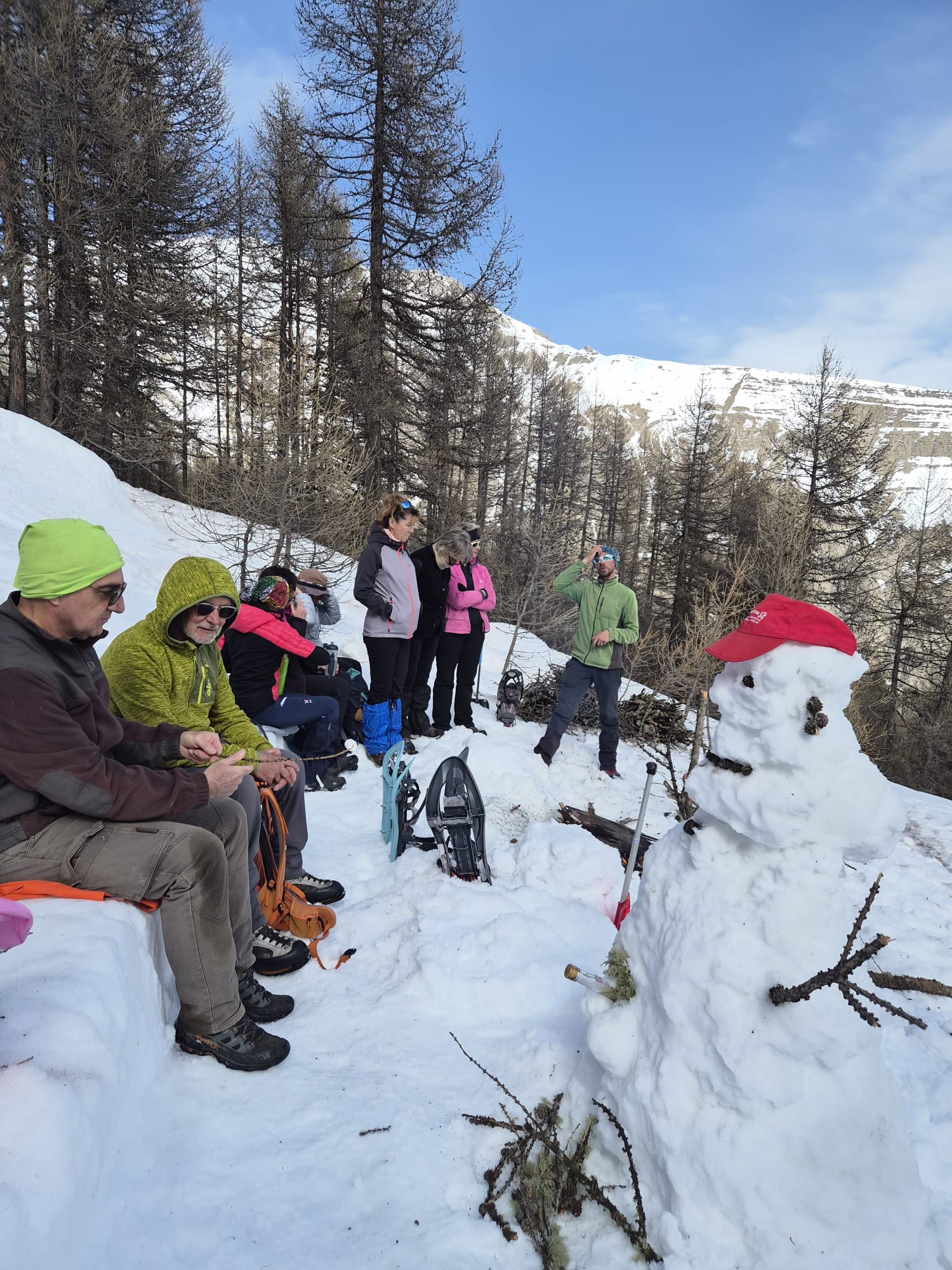 C'est ainsi qu'après avoir cheminé en raquettes, et appris pourquoi les mélèzes perdent leurs aiguilles nous avons : ramassé du bois, de la paille, du lychen, fait un feu 🔥, creusé une banquette dans la neige, dégusté un barbecue, pratiqué le "cul cul glisse" etc, etc ....