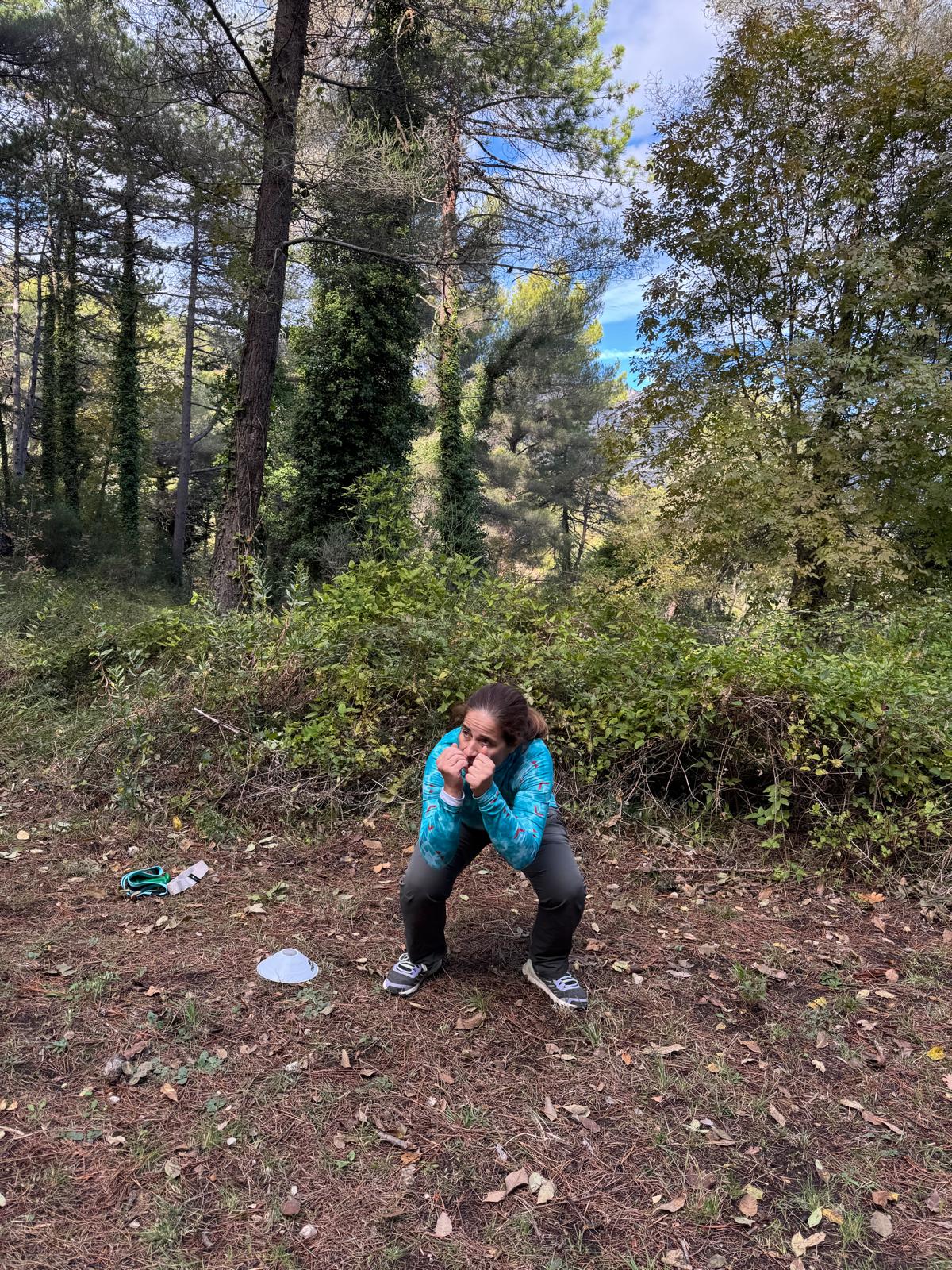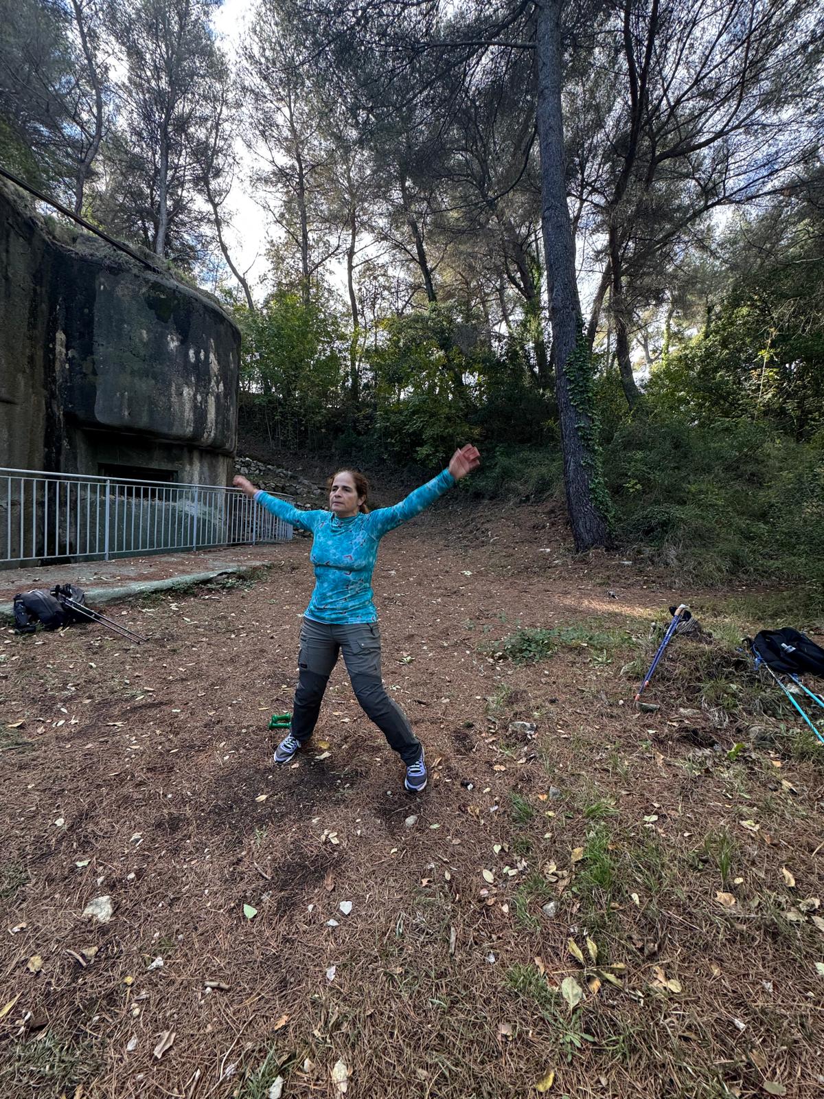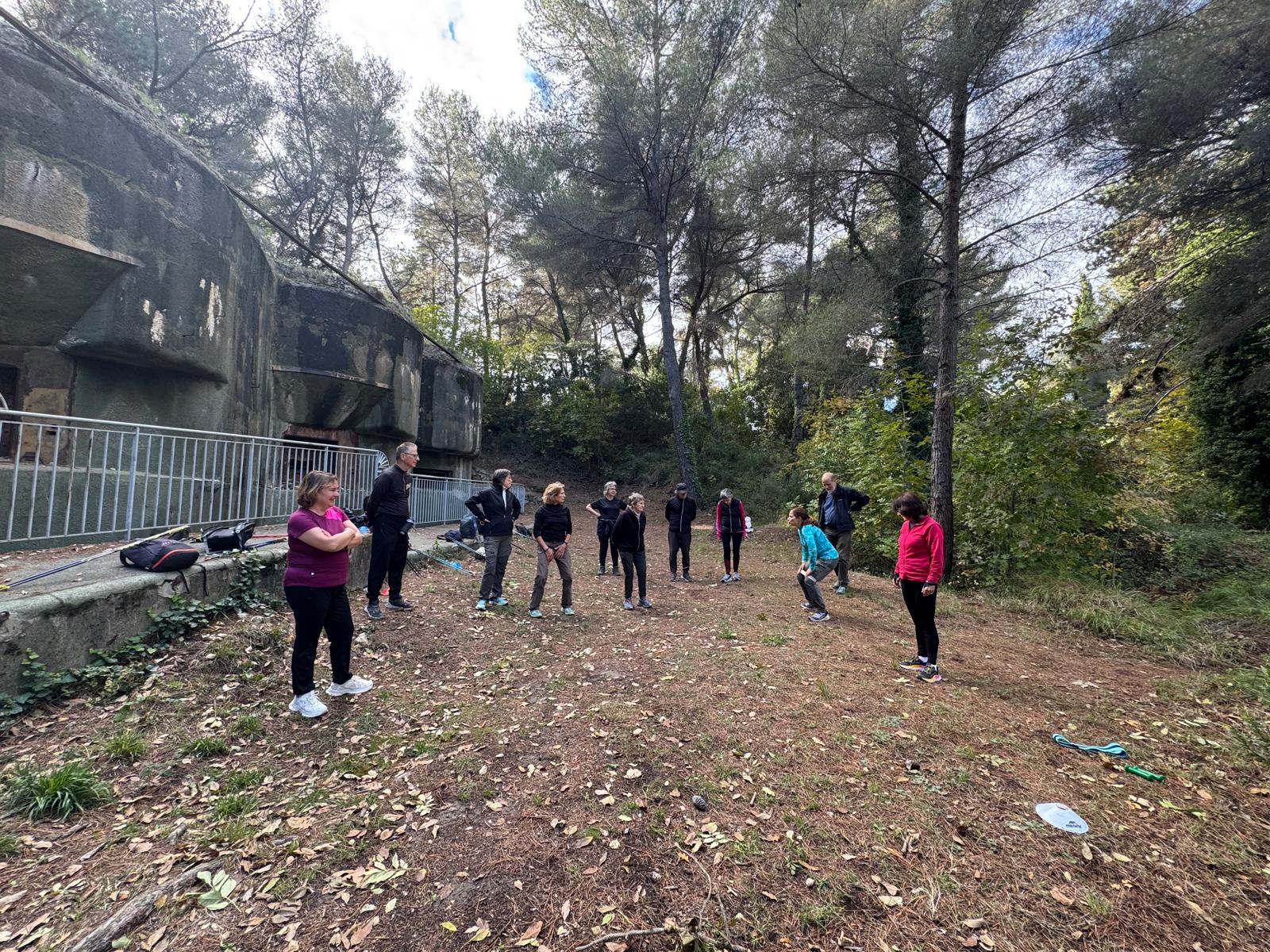 La séance, à la fois complète et exigeante, nous a permis d’emprunter différents sentiers, alternant montées et descentes, tout en intégrant une série d’exercices de renforcement musculaire au milieu des vestiges militaires. Puis, des changements de rythme pour notre cardio, avant de terminer en douceur avec des étirements pour un retour au calme bien mérité.